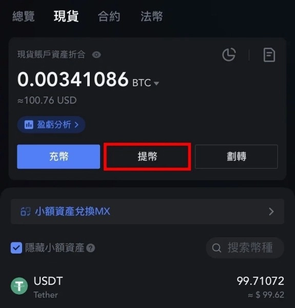 进入资产页面后,按下画面上方的"提币"选项