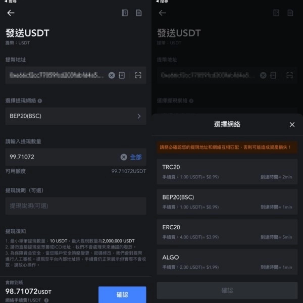 同时选择你提现的"网路"(此处我以币安智能链BSC做示范)。