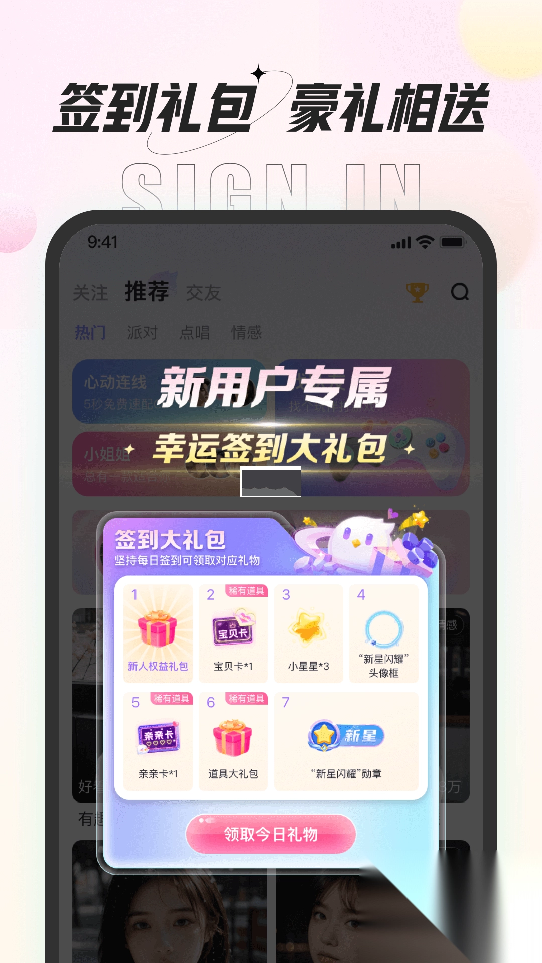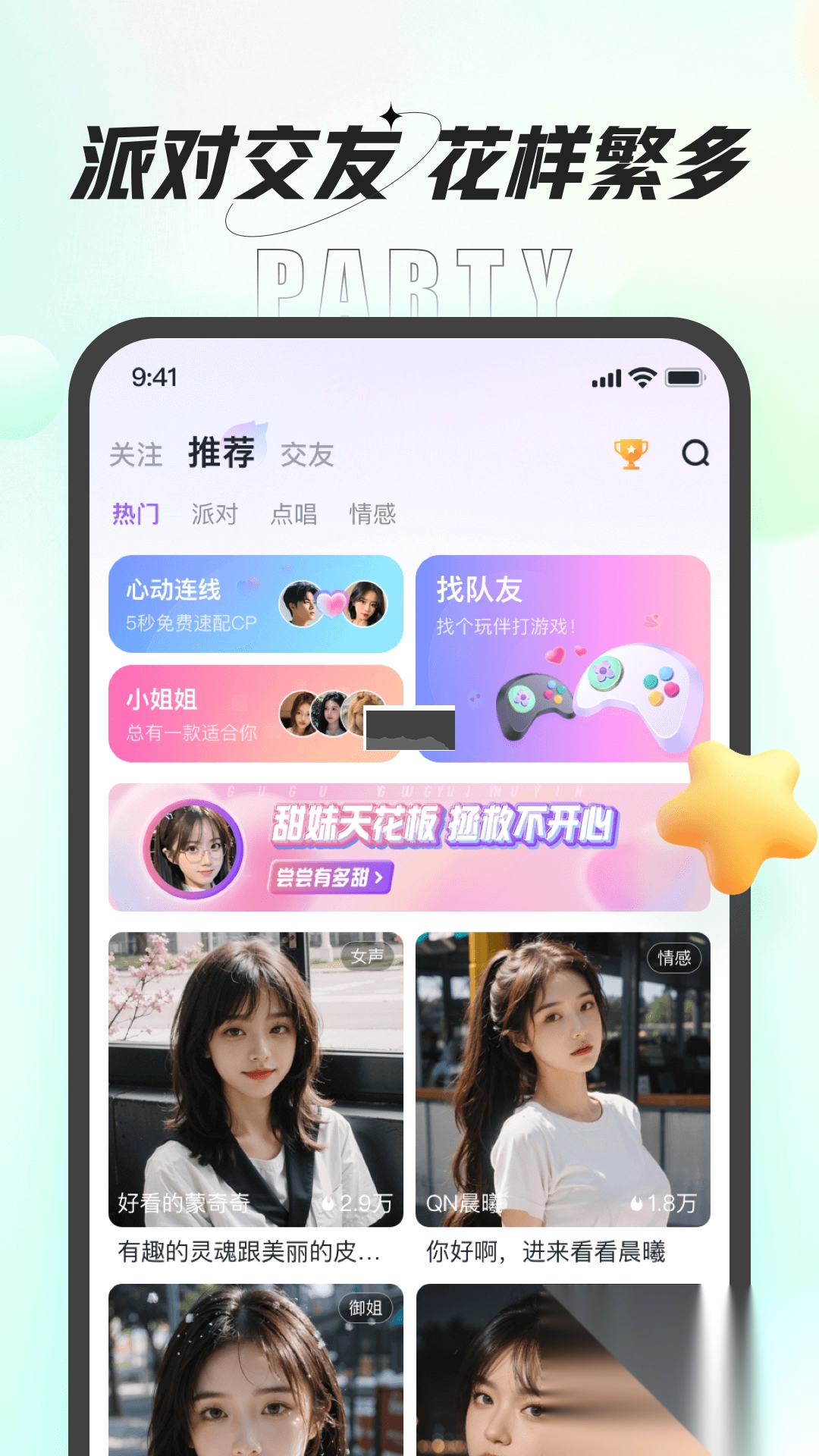 4、丰富玩法:K歌嗨唱、贴心陪聊、真心话大冒险、寻觅CP,全天24小时随时等你来互动。