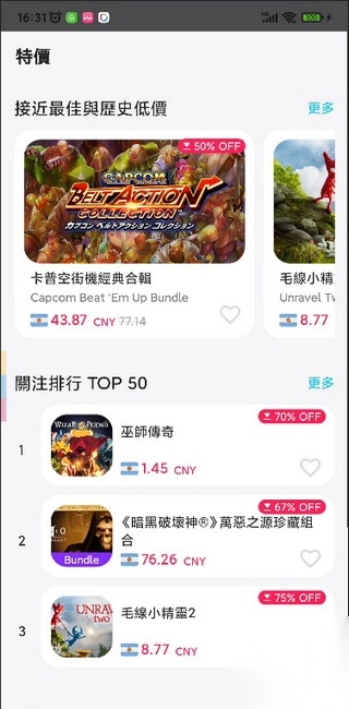7. 在首页的特价板块,能够看到当下最热门的50款折扣游戏,这些游戏普遍价格低廉,且具有较高的知名度,价格区间大致在一两元到十几元之间,性价比十分突出 。