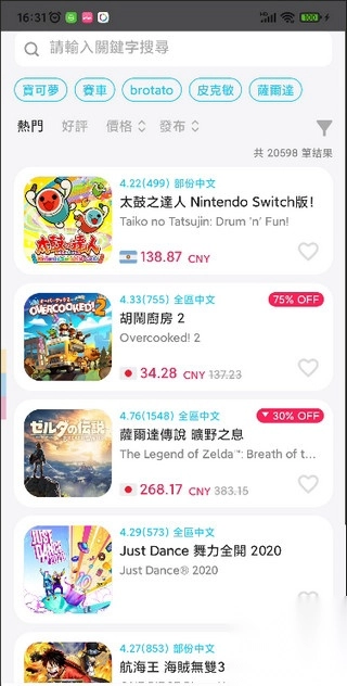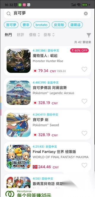 4. 例如输入“宝可梦”,便能够浏览到与宝可梦相关游戏的所有折扣情形 。