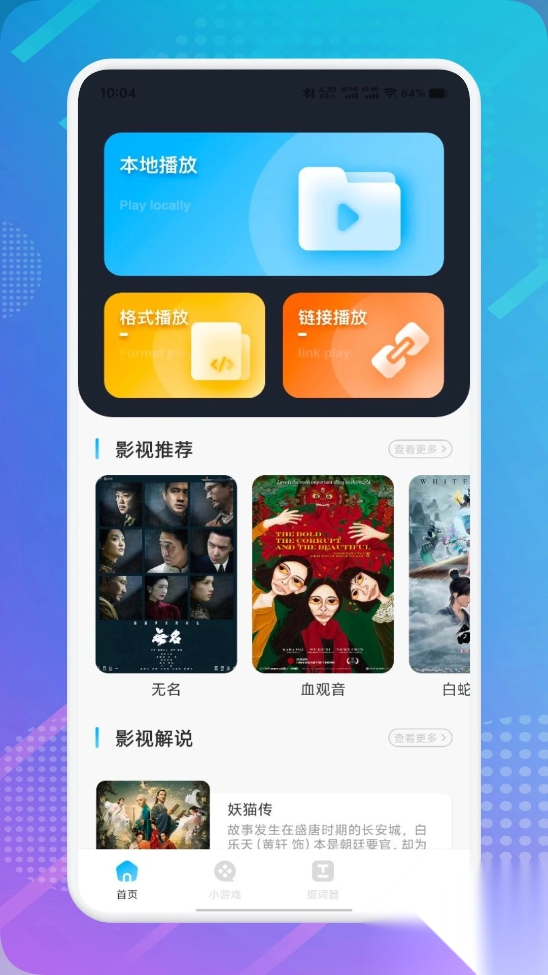 1. 打开软件,它具备本地播放、格式播放、链接播放等功能,同时还提供精彩的影视推荐与影视解说。