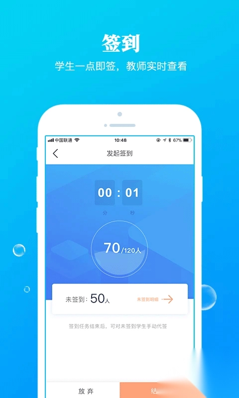 3、签到功能很方便,学生点一下就能完成,老师也能实时查看谁签到了。