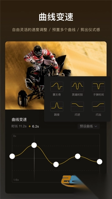 【曲线变速】VN 不仅支持常规变速,还具备曲线变速功能,能轻松为你打造视频快慢交替变化的特效,效果堪比 Premiere 的时间重映射功能。而且,VN 为大家提供了 6 种预置曲线以供参考。