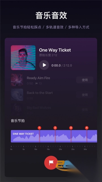 自带免费乐库,支持读取本地音乐。支持节拍标记,更有节奏感。支持多段音乐,调整时长、音量;