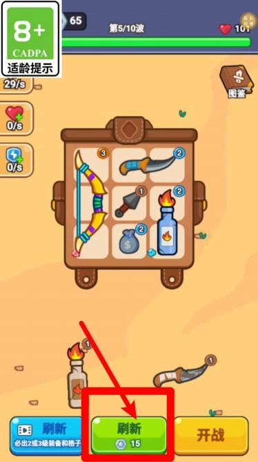 2.装备界面可花费金币刷新道具组合,尝试获取更强装备组合来应对更高波次怪物攻击,刷新不满意可继续更换。