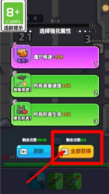 3. 轻点“全部获得”,就能一次性领取三个强化属性,无需逐个确认即可提升角色战力,既节省时间又高效,非常适合快速闯关。