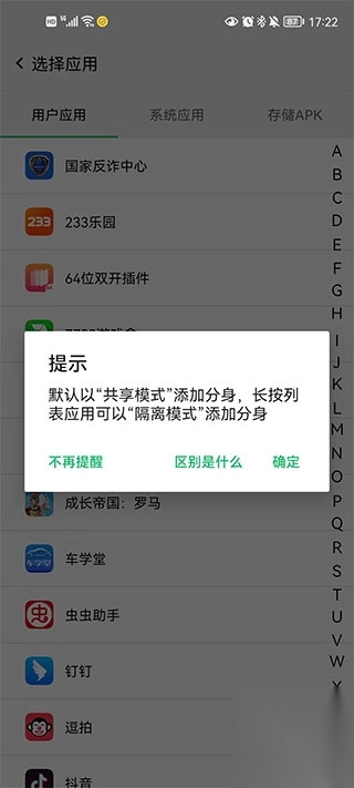 2、快速的选择到你需要分身的应用即可进行应用的多开添加。