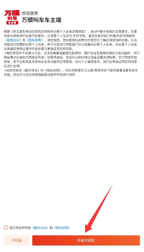 1、打开万顺叫车司机端APP,认真阅读用户协议和隐私政策后,点击同意按钮进入注册界面。