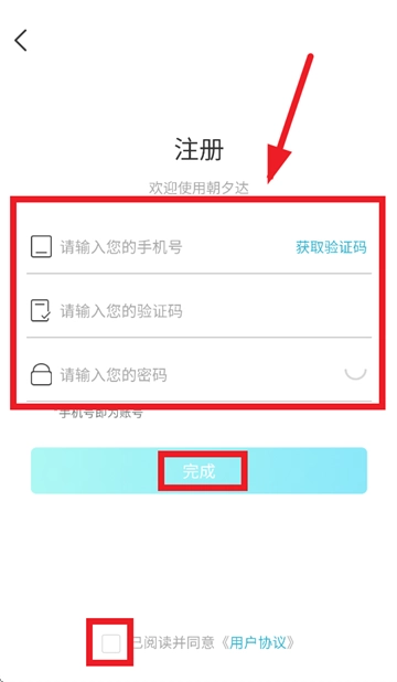 在注册界面输入手机号,验证码,密码,勾选已阅读并同意 《用户协议》,点击完成即可