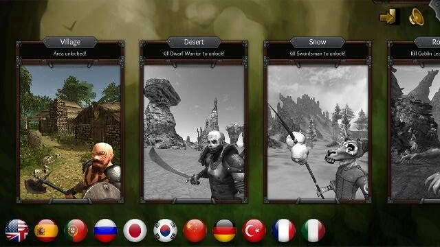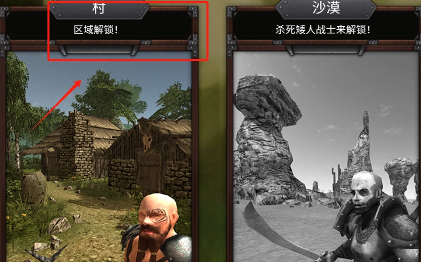 1、游戏提示解锁新区域,点击左侧村直接进入,想解锁沙漠需先击败矮人战士。