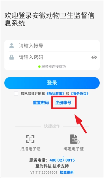 先下载并安装安徽智慧兽医app,安装完成后打开该应用。待进入登录界面,点击“注册账号”选项。