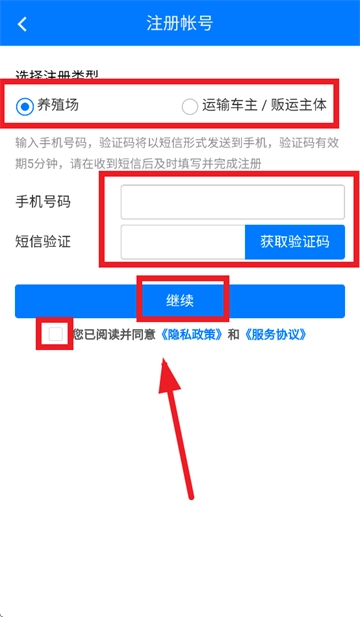 请选择注册类型,接着输入手机号码与短信验证码,然后勾选“您已阅读并同意 《隐私政策》 和 《服务协议》”,最后点击“继续”便可完成操作。