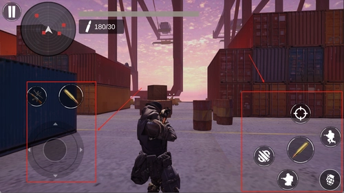 2、屏幕左侧为虚拟摇杆控制移动方向,右侧设有瞄准与射击按钮,界面简洁便于快速操作,适合新手迅速上手。