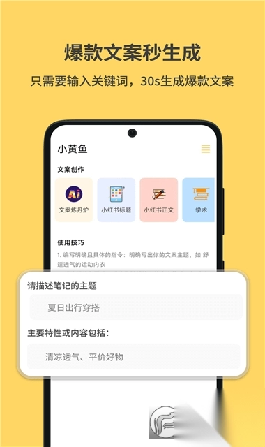 小黄鱼AI文案生成工具,堪称一款极为专业的手机写作软件。借助它,大家不仅能够一键实现文案的自动生成,更有海量模板可供直接自动套用与编辑。在这款应用里,用户完全可以依据自身需求,生成契合的文案,轻松搞定文案制作,畅享全方位的文本写作服务。