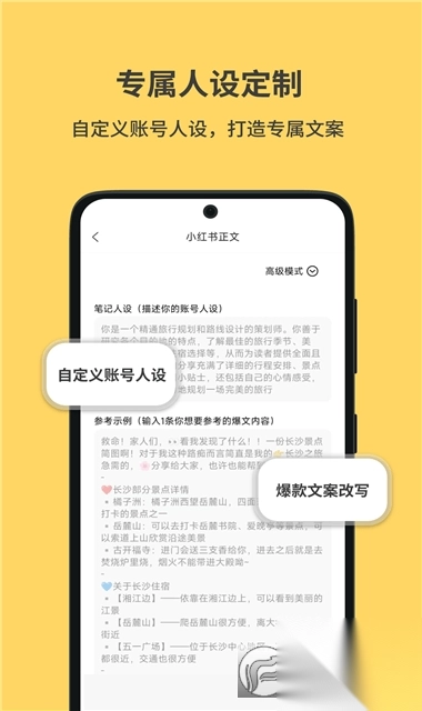 支持用户在线进行自定义账号的人设定制,做出自己的专属文案