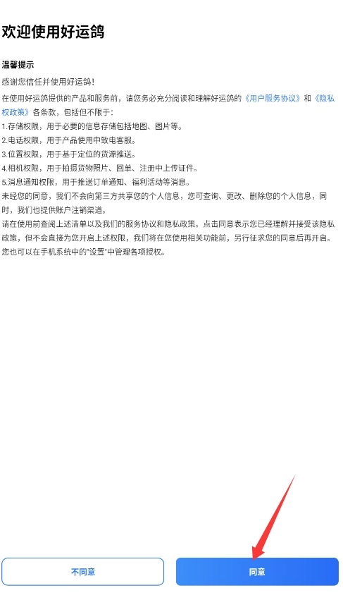 1. 开启好运鸽司机APP,首先查看用户协议与隐私政策,若没有问题,点击同意后继续进行后续操作。