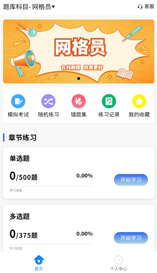 1、进入网格员考试学知题APP,选择"章节练习"模块点击"开始练习"按钮进入题库。