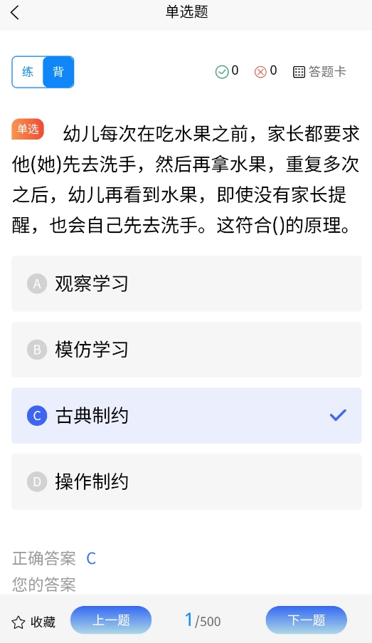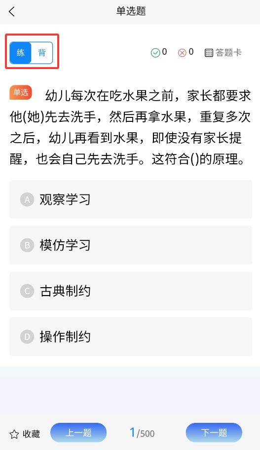 2、在单选题模式下,可通过"练习/背诵"切换键自由选择答题训练或记忆学习模式。