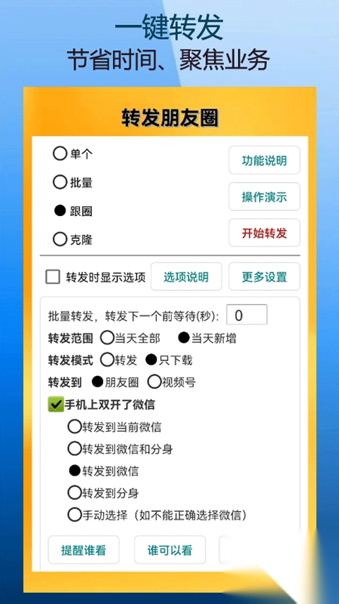 微商朋友圈一键转发软件,原名简道朋友圈转发器,是一款对微商营销与引流极为实用的app。借助它,能轻松实现朋友圈动态的一键转发,无论是文字、相册,还是音频、视频、网页链接,统统都能一键搞定。这款软件可以助力微商朋友吸引更多客户,实用性超强。 该软件所涵盖的朋友圈资源十分丰富,不仅有趣味图片,还有10s短视频、表情包、励志话语,以及知识百科和英文资源等。无论你期望打造何种氛围的朋友圈,在这里都能找到相应资源,一键选择,方便快捷。