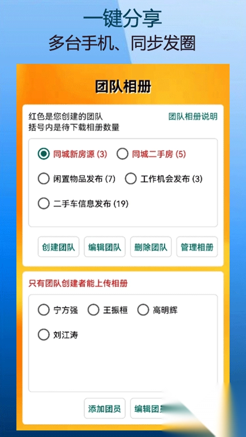 通过团队相册,将编辑好的发圈素材提前分发给团队,实现多台手机(自己的、公司同事的、下级代理的)同步发圈,其他人无需等待您发圈后再转发。