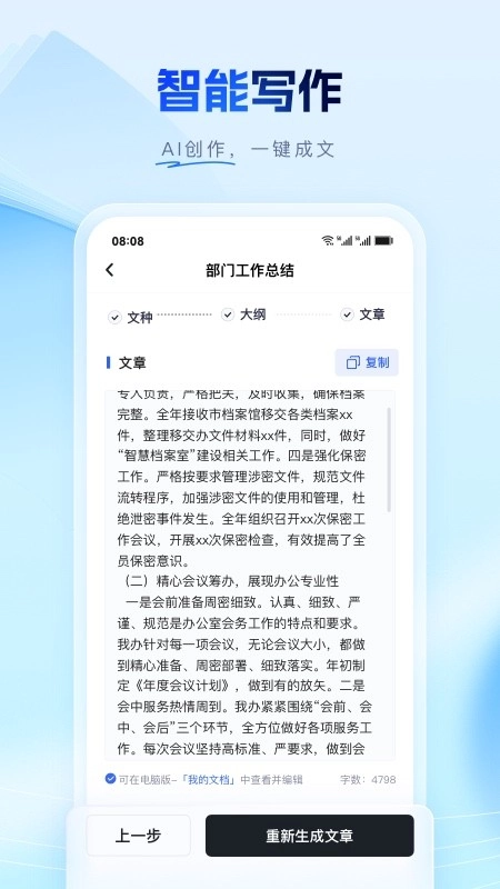 1. 公文写作全面覆盖:包含述职报告、领导讲话等数十种公文类型,同时提供校对润色以及提纲生成服务,助力文稿呈现出更专业、更出色的品质。