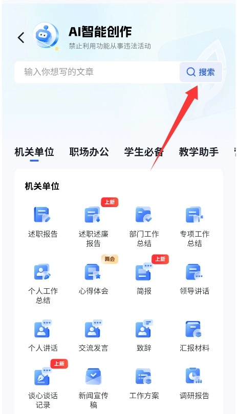 2、可在搜索栏输入文章关键词来查找,也能直接选用系统推荐的写作模板,从而快速开启。
