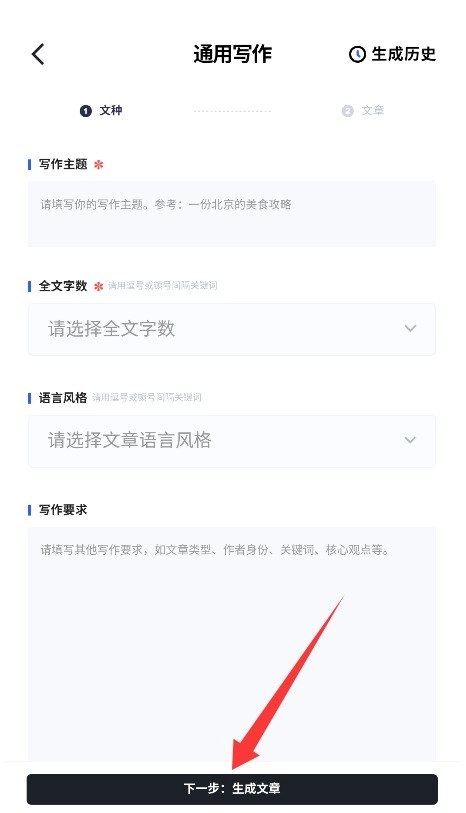 3、填写文章标题、设定内容长度和写作风格等参数,点击生成文章系统将自动生成符合要求的文稿。