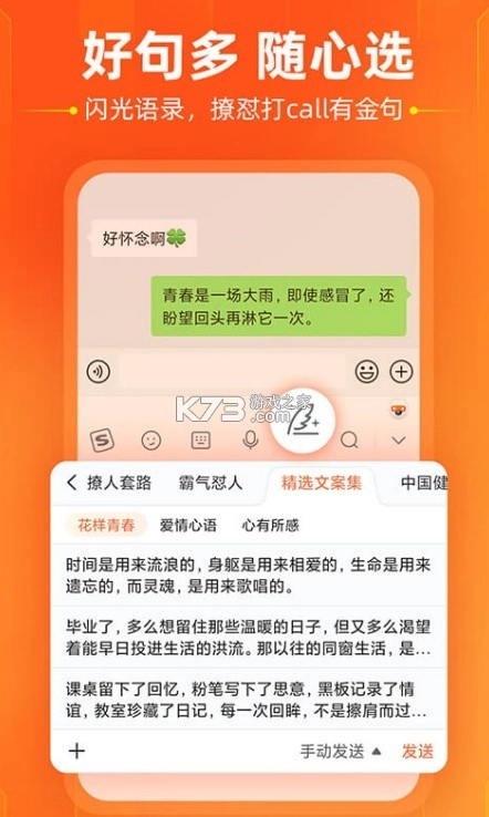 【闪光语录】键盘闪光语录升级,新增推荐收藏功能,更多好句助你表达。