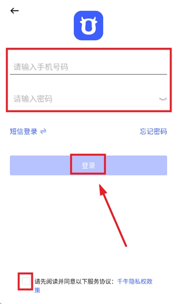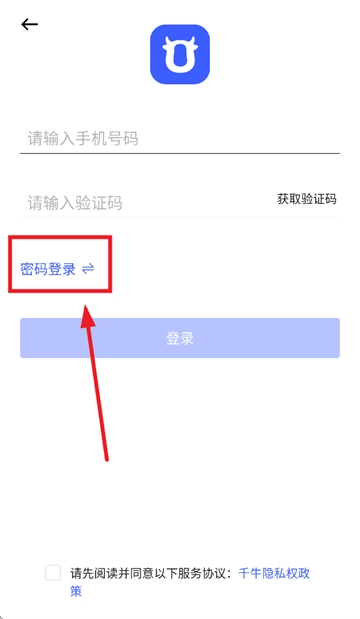 输入手机号,密码,勾选请先阅读并同意以下服务协议:千牛隐私权政策,点击登录即可