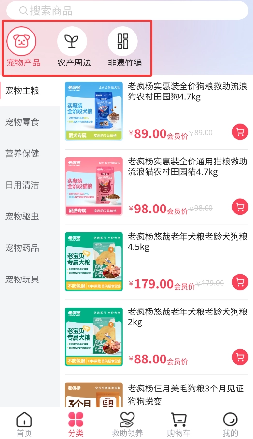 2. 借助分类导航,能够迅速筛选出宠物食品、玩具、护理用品等各类不同商品。
