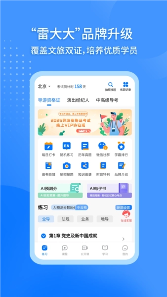 导游证雷大大是北京蜗牛漫步教育科技有限公司精心打造的一款软件,专为导游证考生提供备考服务。软件涵盖最新的全国导游考试以及各省新增导游考试真题,涉及科目一“政策与法律法规”、科目二“导游业务” 、科目三“全国导游基础知识”、科目四“地方导游基础知识”、科目五“导游服务能力”等。借助这款软件,用户能够更全面地掌握考试内容,更轻松地获取考试技巧,从而快速通关导游考试。有需要的朋友们,赶快下载吧!