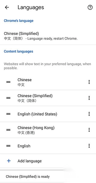 6、完成选择后,页面会返回上一个界面,同时屏幕下方会弹出重启Chrome的提示。此时,我们只需点击【Restart Chrome】,待Chrome浏览器重启完毕,就能看到浏览器已变为中文界面。