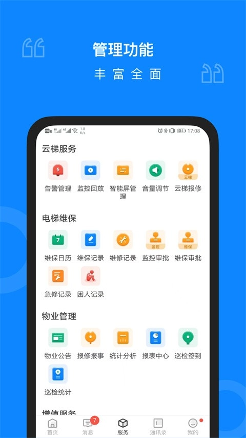 维小保这款电梯管理软件十分实用,专注于电梯安全管理。只要连接网络,就能随时随地查看电梯运行状况,一旦出现问题会立刻报警。物业通过手机就能进行监控,电梯的状态一目了然。业主报修也极为便捷,在APP上简单操作几下即可。最让人省心的是它能自动记录保养情况,并且会在该检修的时候发出提醒。各类电梯数据报告都能查询,大大减轻了物业的工作负担。
