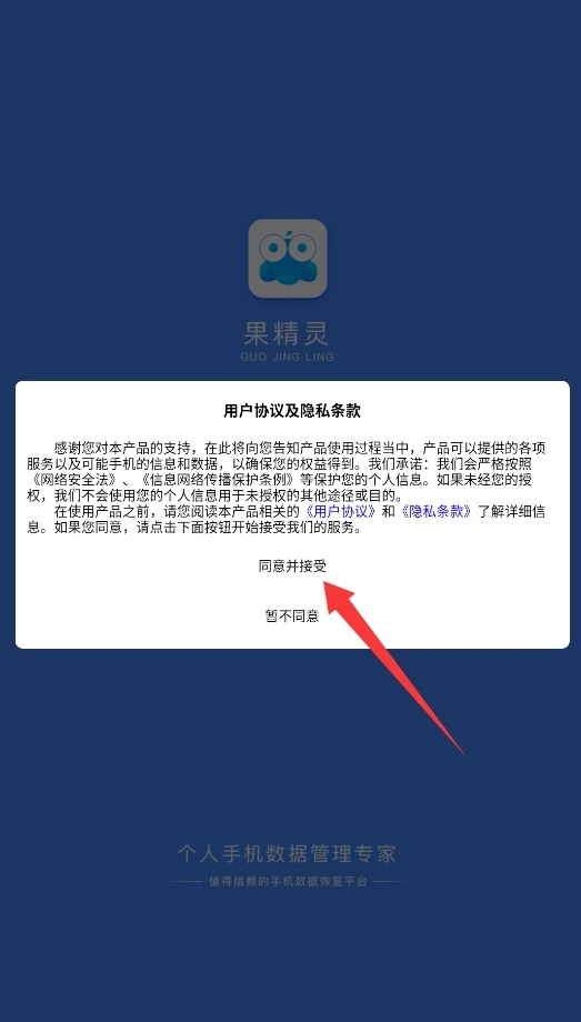 1、首次使用果精灵APP需完整阅读用户协议与隐私条款,确认同意后点击进入按钮跳转至应用主界面。