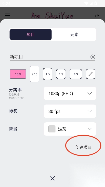 设置新项目大小,分辨率,帧频,背景等等,点击创建新项目
