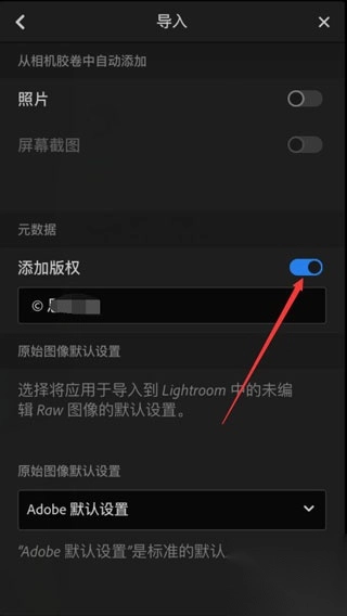 4、进入导入界面后,下方有个“添加版权”选项,打开该选项,其中水印的名字能够进行更改。