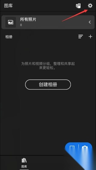 2、进入到LR首页里面后,在图库的最右上角有设置图标。