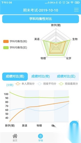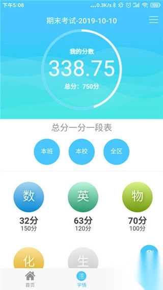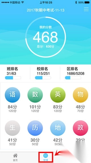 4、登录后,点击底部【学情】菜单,就可以查看到各科的成绩了。