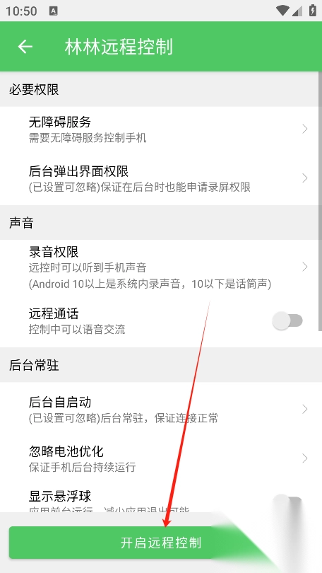 2、首次使用,进入首页点击“开启远程”按钮。接下来,务必打开手机的无障碍权限,系统会提示您授权该App访问无障碍功能。