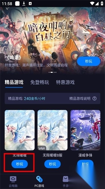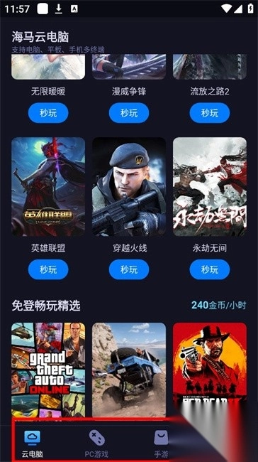 3、登录后在云电脑、pc游戏、手游这三个分区中找到感兴趣的游戏;