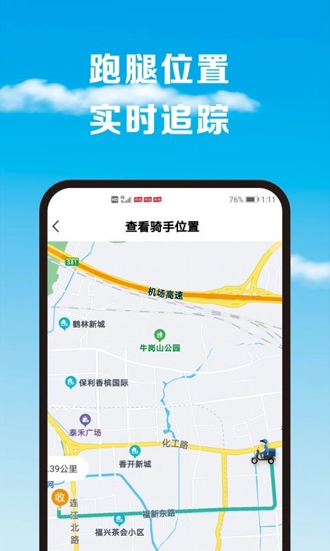 3、进入订单页面,实时查看骑手位置和配送进度,随时掌握物品运送状态,清楚了解预计送达时间。