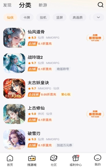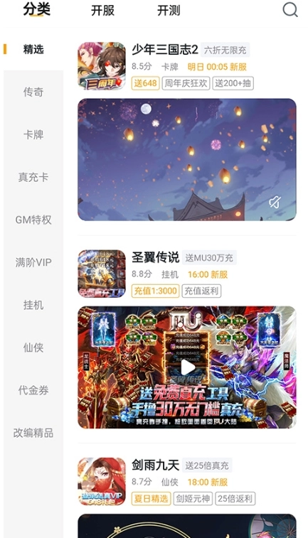 3、精选、传奇、卡牌、真充卡、gm特权、仙侠等多种游戏进行分类,可以根据自己喜欢的类型挑选游戏进行体验
