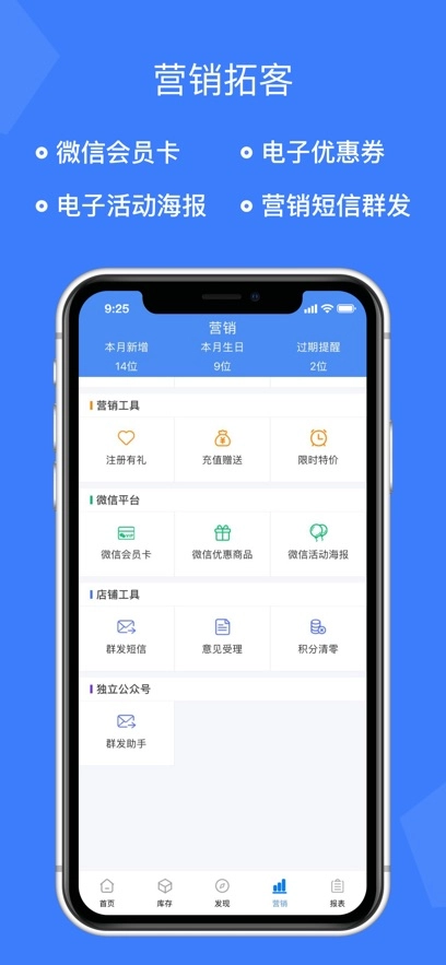 【微信营销】卡券营销:会员消费赠送,推动拉新及二次消费消费提醒:信息实时到达,免拦截,免短信费用优惠促销:优惠活动/商品发布,吸引返店消费e会员平台:会员消费、余额、积分自助查询,会员互动等