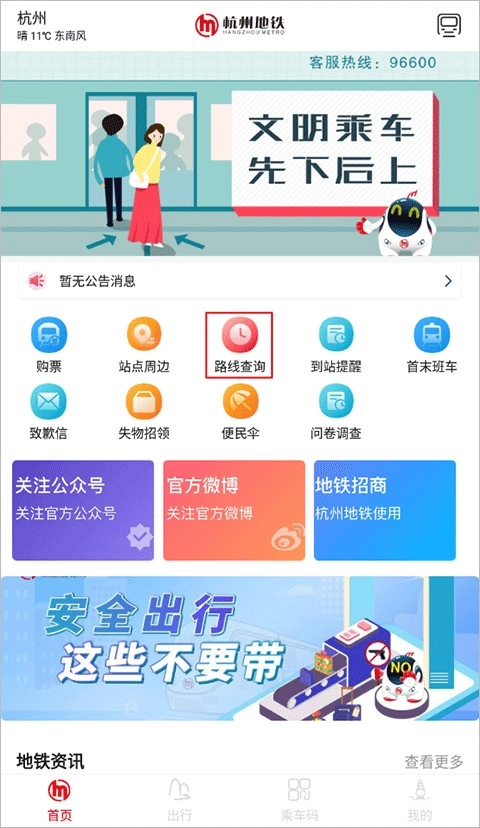 1、进到杭州地铁app,在首页上方选择“路线查询”