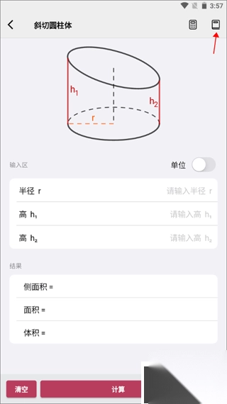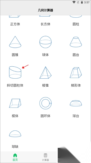 1. 开启几何计算器app,映入眼帘的是诸多几何模型,就拿斜切圆柱体来说,点击该模型。