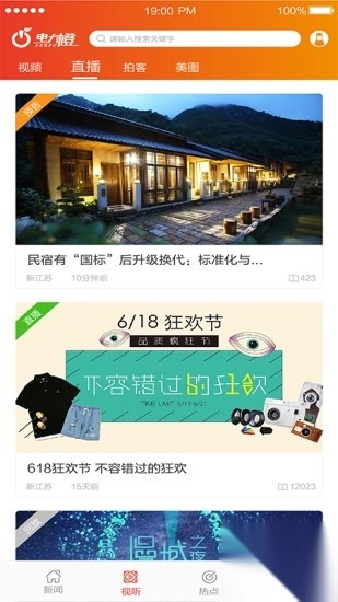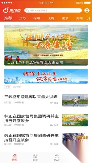 电力橙手机版搭建了一个面向江苏电力系统的平台,该平台整合了苏电新闻、直播、拍客、美图等各类资讯内容。用户打开电力橙手机版,映入眼帘的便是首页,首页划分为新闻、视听、热点以及我的这四个模块。