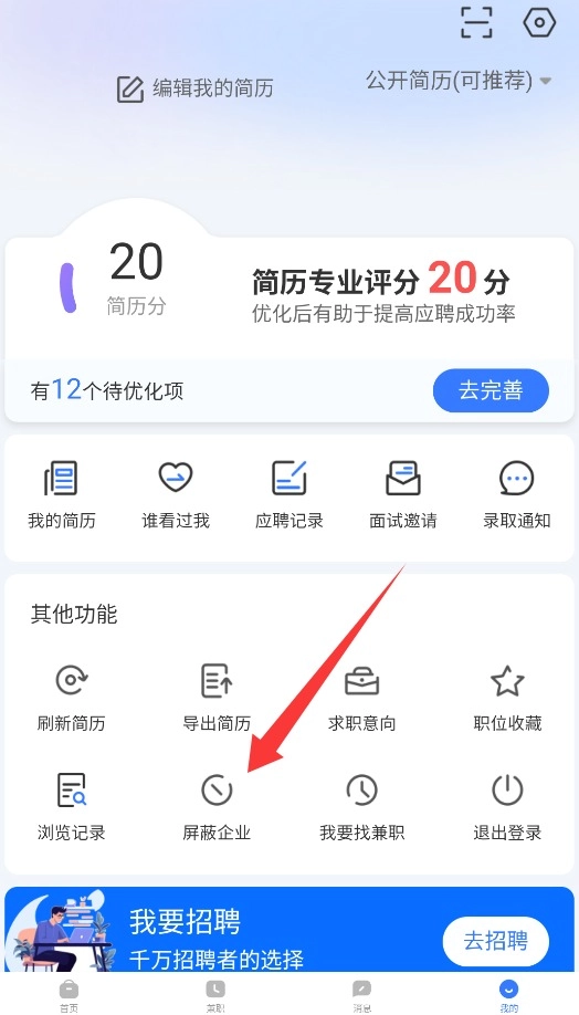 2、进入个人中心页面后,找到屏蔽企业功能选项,点击进入企业屏蔽管理界面。