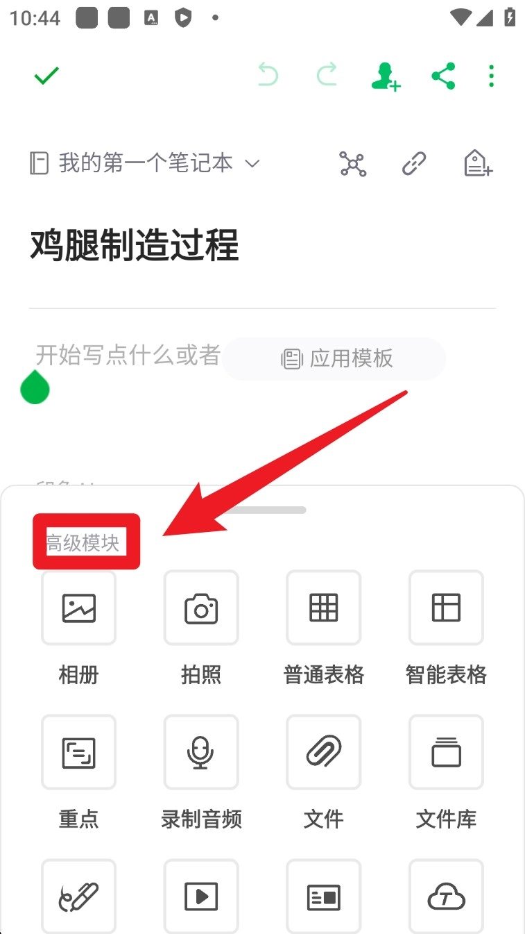 5. 点击页面左下角的「+」按钮,可添加表格、音频、文件、重点标注等内容。