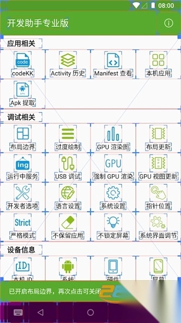 1. 快速打开或关闭开发者选项中的选项。将原来几十秒的操作缩短为一次点击。包括显示布局边界、显示 GPU 过度绘制、显示布局更新、强制 GPU 渲染、显示 GPU 视图更新、显示指针位置、严格模式、不保留活动、不锁定屏幕。